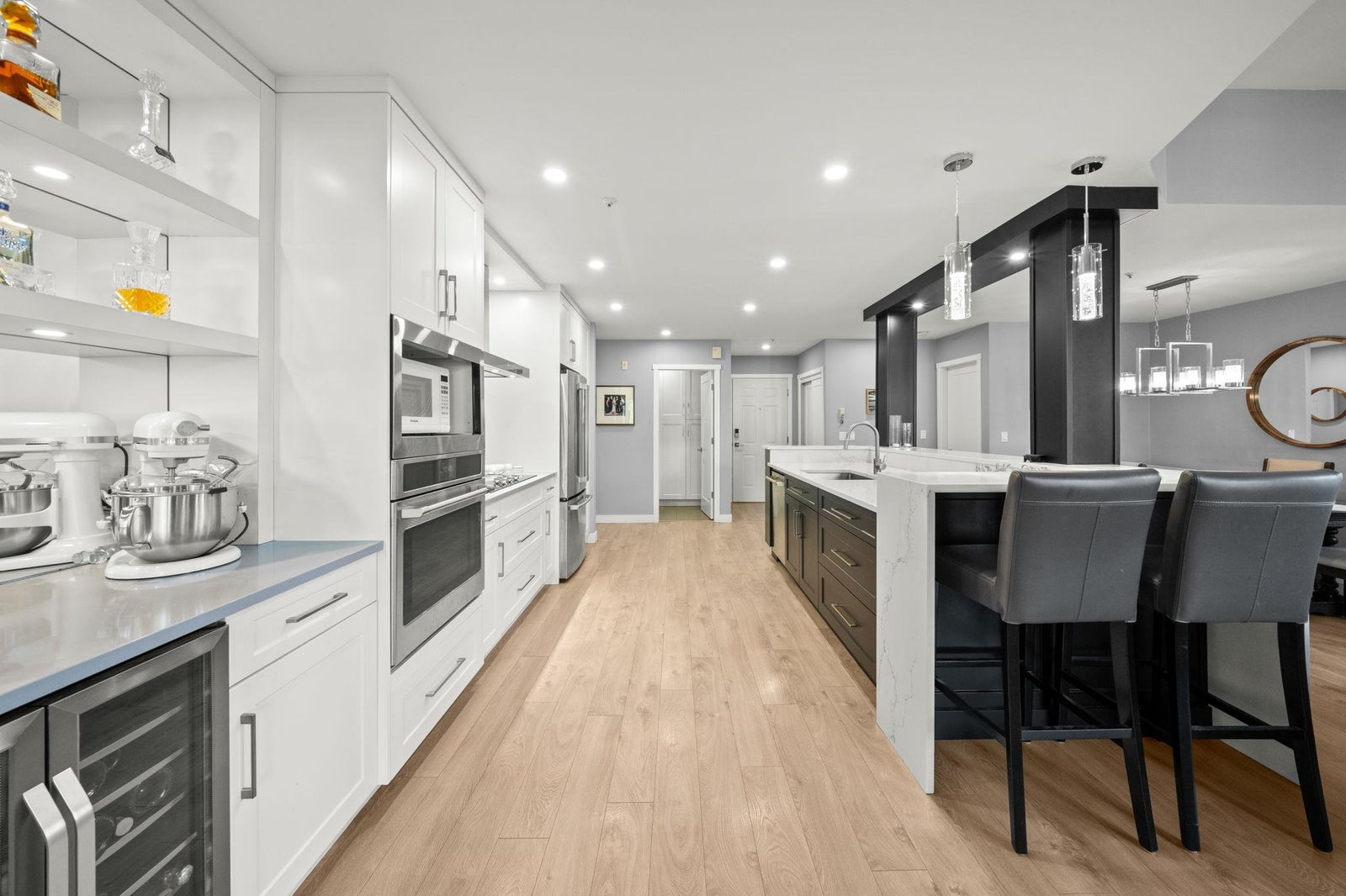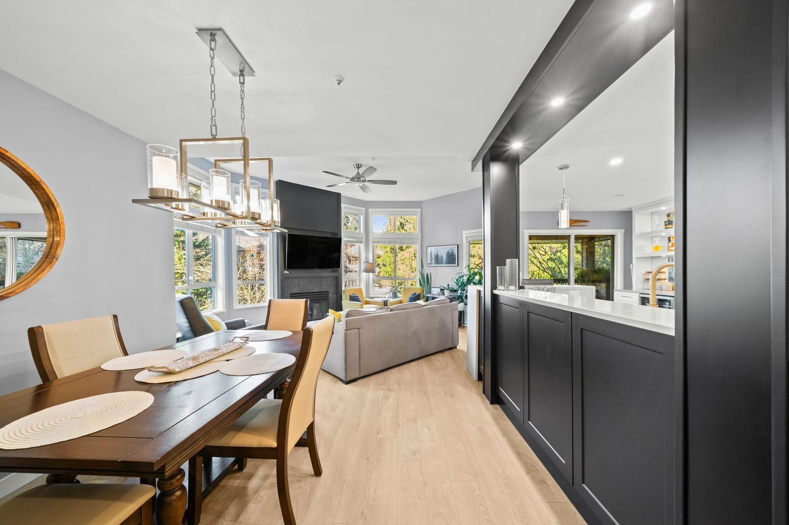 Stunning Top-Floor Corner Home in the Heart of Lynn Valley. This beautifully renovated top-floor corner unit offers the perfect blend of style, comfort, and location. At the heart of the home, a gorgeous chef’s kitchen features an oversized island ideal for entertaining, complemented by rich hardwood flooring throughout. Soaring vaulted ceilings and a cozy gas fireplace create a bright, inviting living space, while thoughtful separation between bedrooms ensures privacy. The spacious primary retreat is paired with a spa-inspired bathroom, complete with a walk-in shower and makeup vanity. Step outside to the large, covered patio—perfect for morning coffee or relaxing with a glass of wine in the evening.